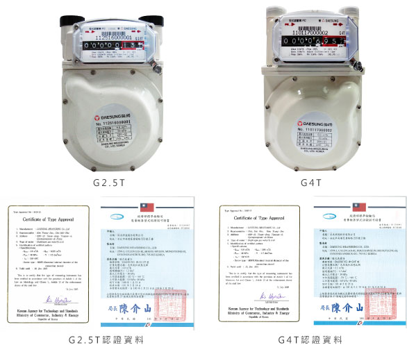 G2.5T與G4T膜式氣量計:兩款瓦斯錶不僅榮獲OIML與韓國認證,亦已取得國內經濟部標準檢驗局型式認證。